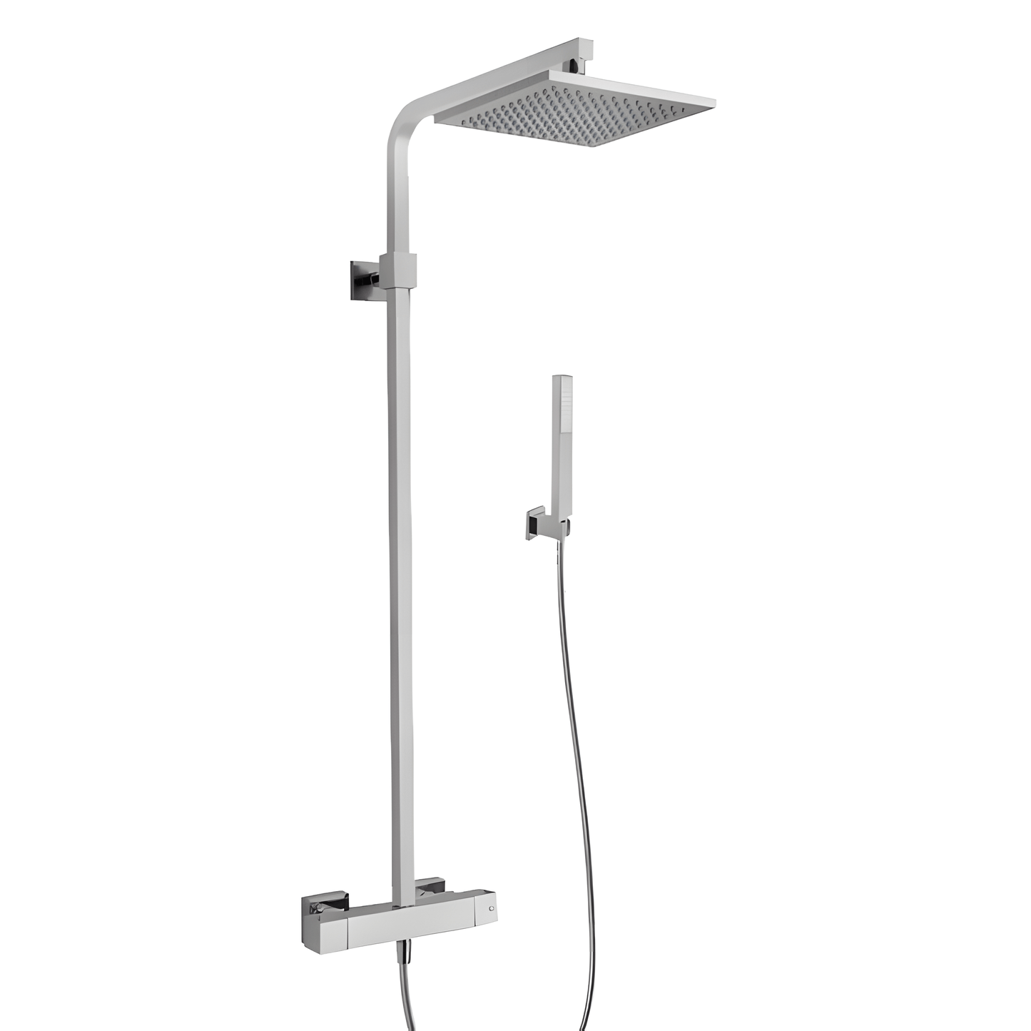 Shower Column With Thermostatic Mixer, with 100 degrees safety button, integrated diverter, 10'' x 10'' shower head, 1-jet square hand shower, 78'' flexible hose, brass tube with wall mounted shower holder. This is available in Polished Chrome, Brushed Gold PVD, Brushed Nickel PVD or Matte Black PVD.